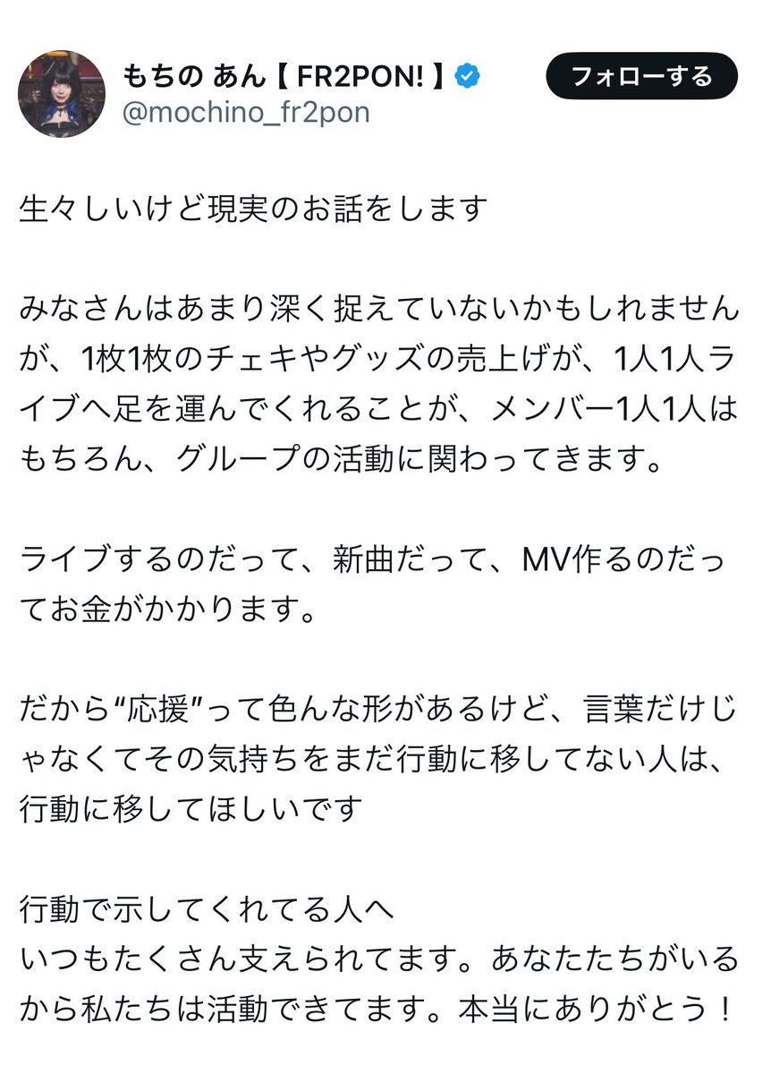 アイドル「ライブするのも曲作るのもMV作るのもお金がかかります。応援って色んな形あるけど言葉だけでなく行動に移してほしいです」