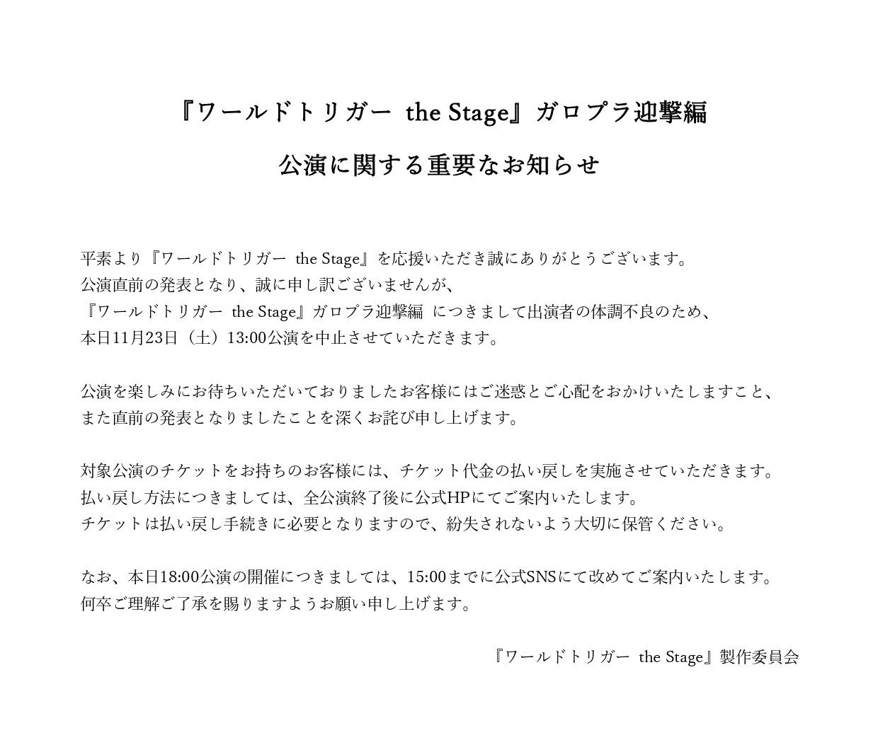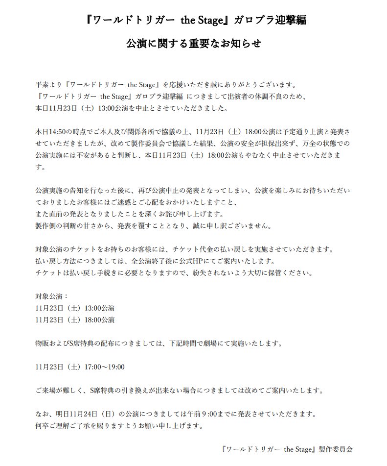 本日11/23(土)13:00公演の中止につきまして、公演直前のご案内となり、大変申し訳ございません。