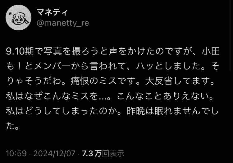 マネティ「9.10期で写真を撮ろうと声をかけたのですが、小田も!とメンバーから言われてハッとしました。痛恨のミスです。大反省してます