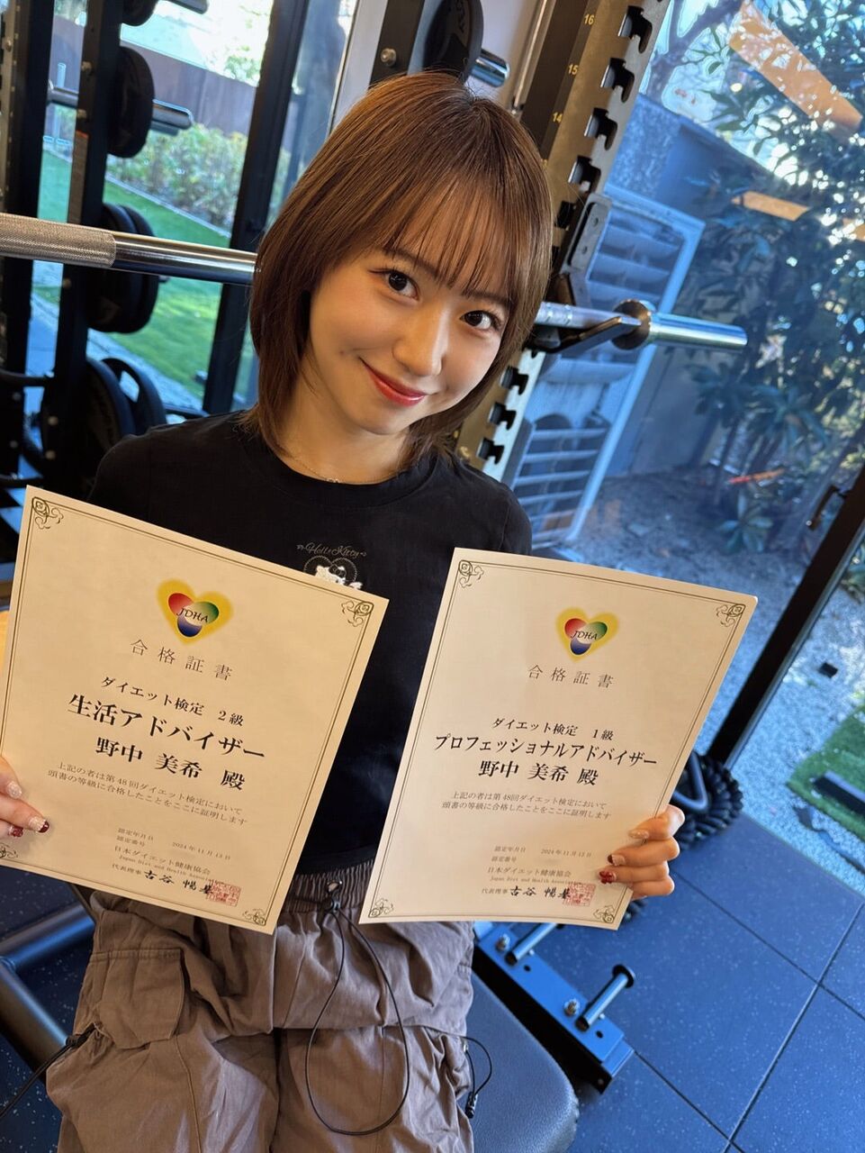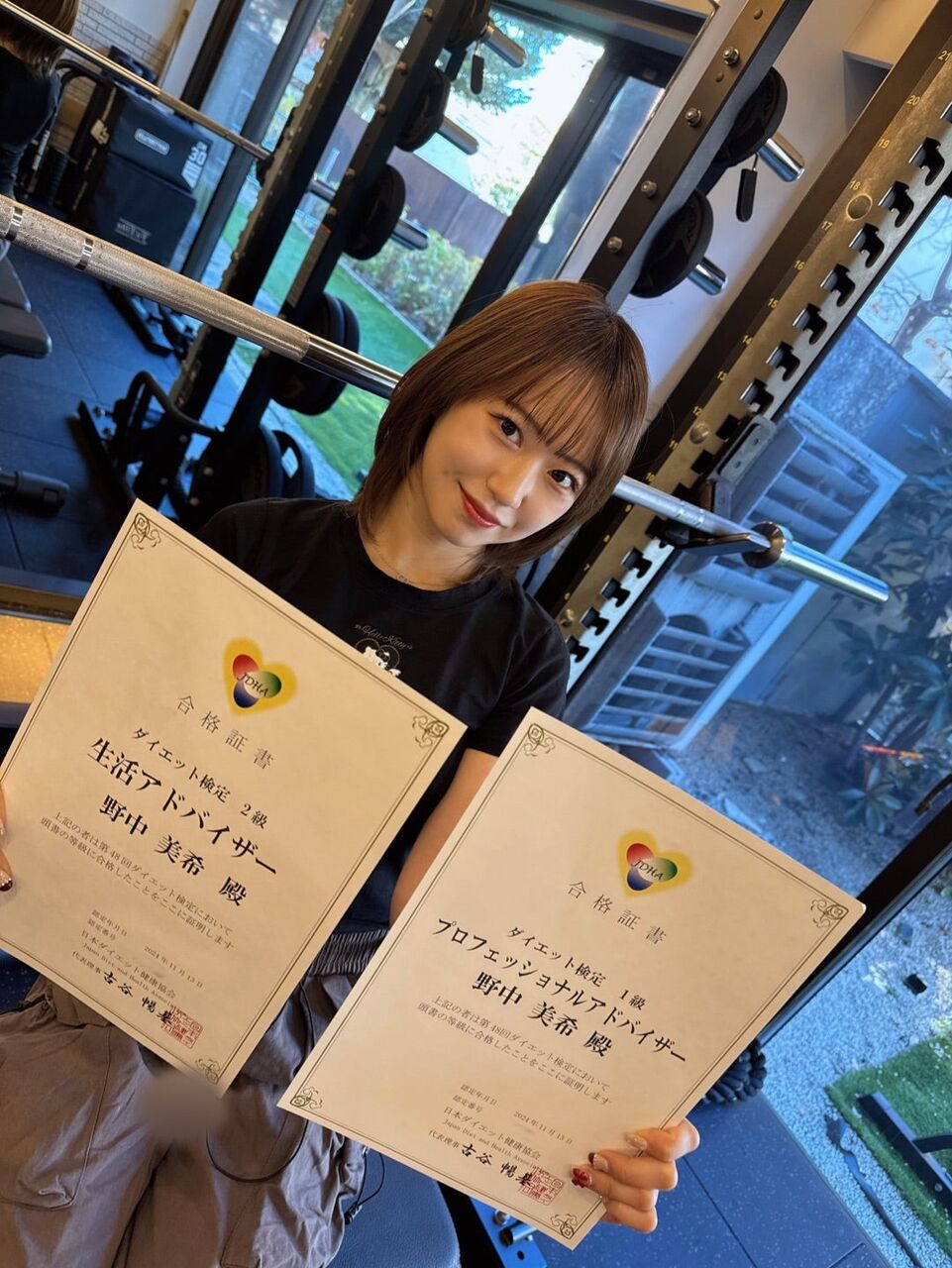 野中美希「ダイエット検定 1級・2級、プロフェッショナルアドバイザー、生活アドバイザー。資格を取得したことをご報告させて頂きます」