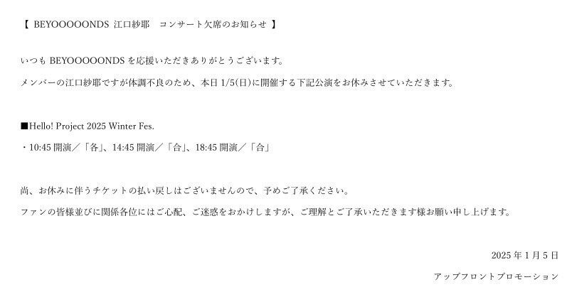 BEYOOOOONDS江口紗耶コンサート欠席のお知らせ