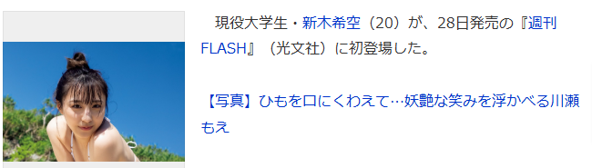 現役大学生・新木希空(20)が、28日発売の『週刊FLASH』(光文社)に初登場した。