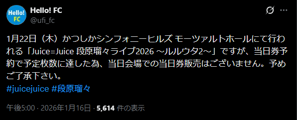 1月22日(木)かつしかシンフォニーヒルズ モーツァルトホールにて行われる「Juice=Juice 段原瑠々ライブ2026 ~ルルウタ2~」ですが、当日券予約で予定枚数に達した為、当日会場での当日券販売はございません。予めご了承下さい。