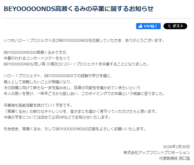 BEYOOOOONDS高瀬くるみの卒業に関するお知らせ